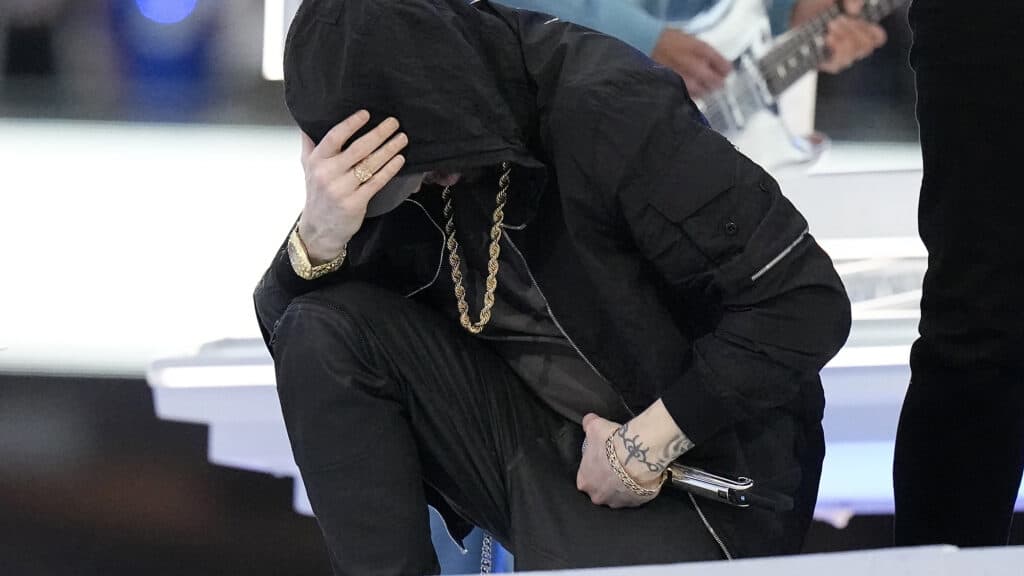 Eminem kneels down during the halftime performance at the NFL Super Bowl 56 football game between the Los Angeles Rams and the Cincinnati Bengals Sunday, Feb. 13, 2022, in Inglewood, Calif. (AP Photo/Chris O’Meara)